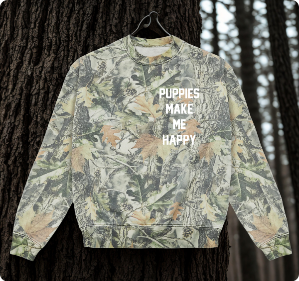 Puppies Make Me Happy Wood Camo Crewneck Sweatshirt | Ultra-Soft Dog Lover Gift