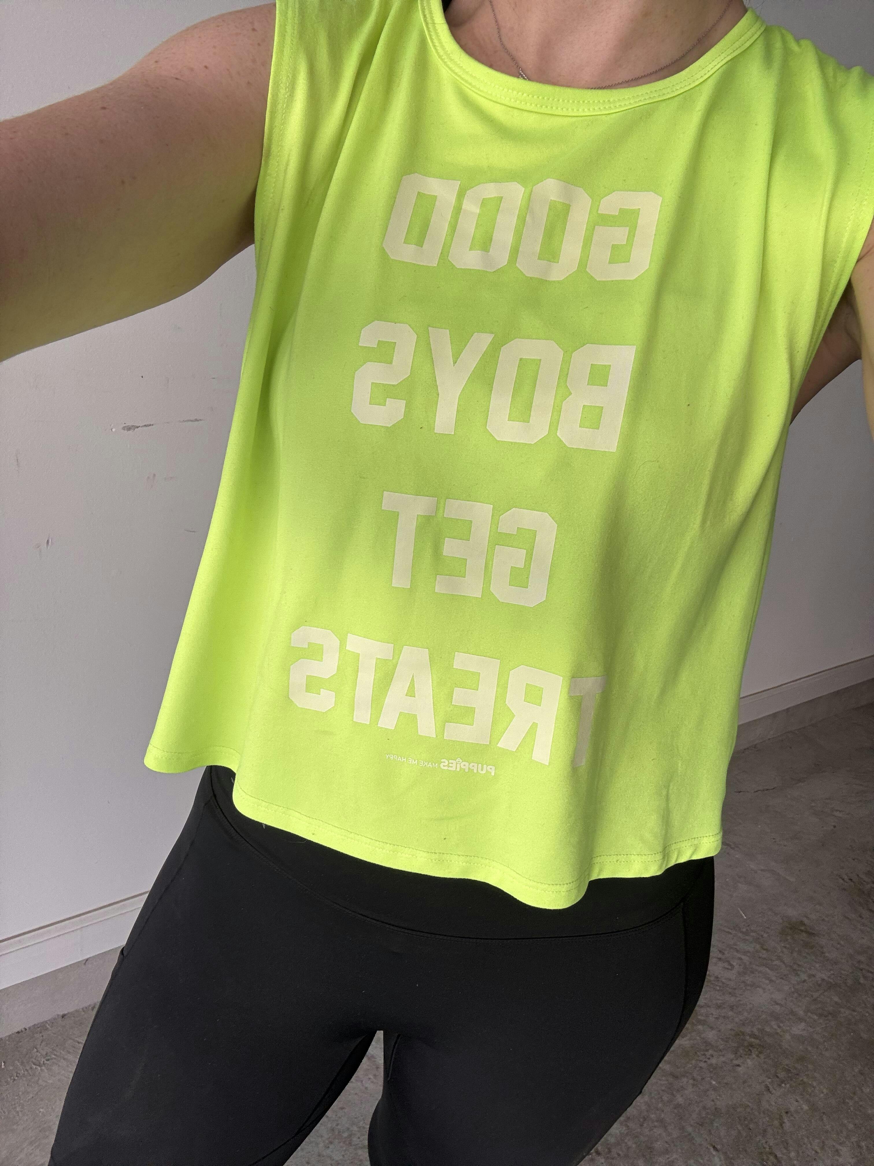 1. What is the fit of the Good Boys Get Treats crop top? This women’s crop tank has a flattering, relaxed fit that pairs well with high-waisted leggings or jeans. It’s designed to be comfy without feeling too tight or too loose.